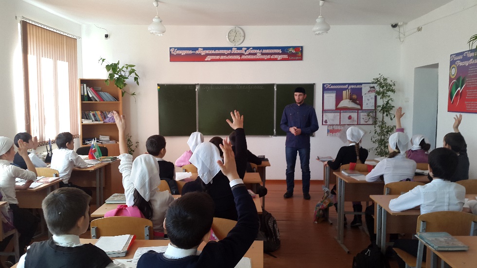 В целях профилактики ранних браков и во исполнение протокольных поручений Главы Чеченской Республики Р.А.Кадырова от 24.10.2015 года № 01-128 принято решениео запрете проведения обрядов бракосочетания несовершеннолетних, педагог по ДНВ Юсупов Р.А. провелразъяснительную работу с обучающимися 8 класса.