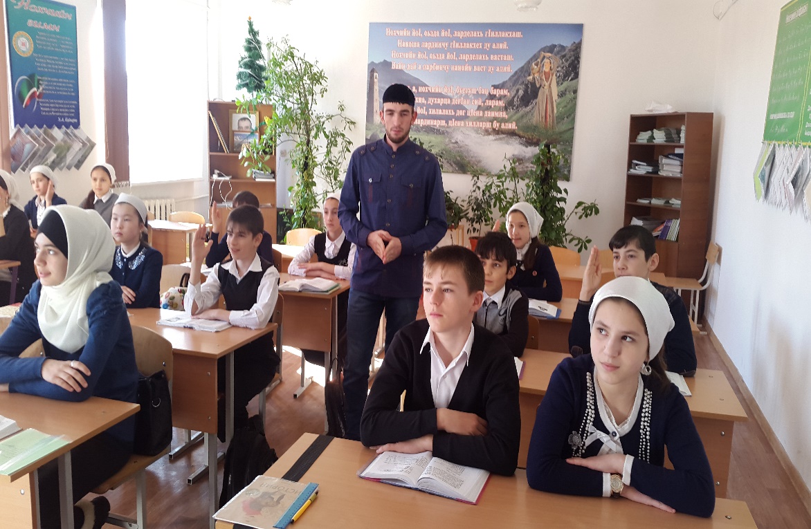 Цель: довести до школьников что, авлия (святые) на Кавказе внесли огромный вклад в сохранении исламских ценностей, и становлении духовности чеченского народа. Воспитывать уважительное отношение к суфизму как теоретически и практически совершенная, ценная система, опирающаяся на основы, извлеченные из благородного Корана и Сунны.