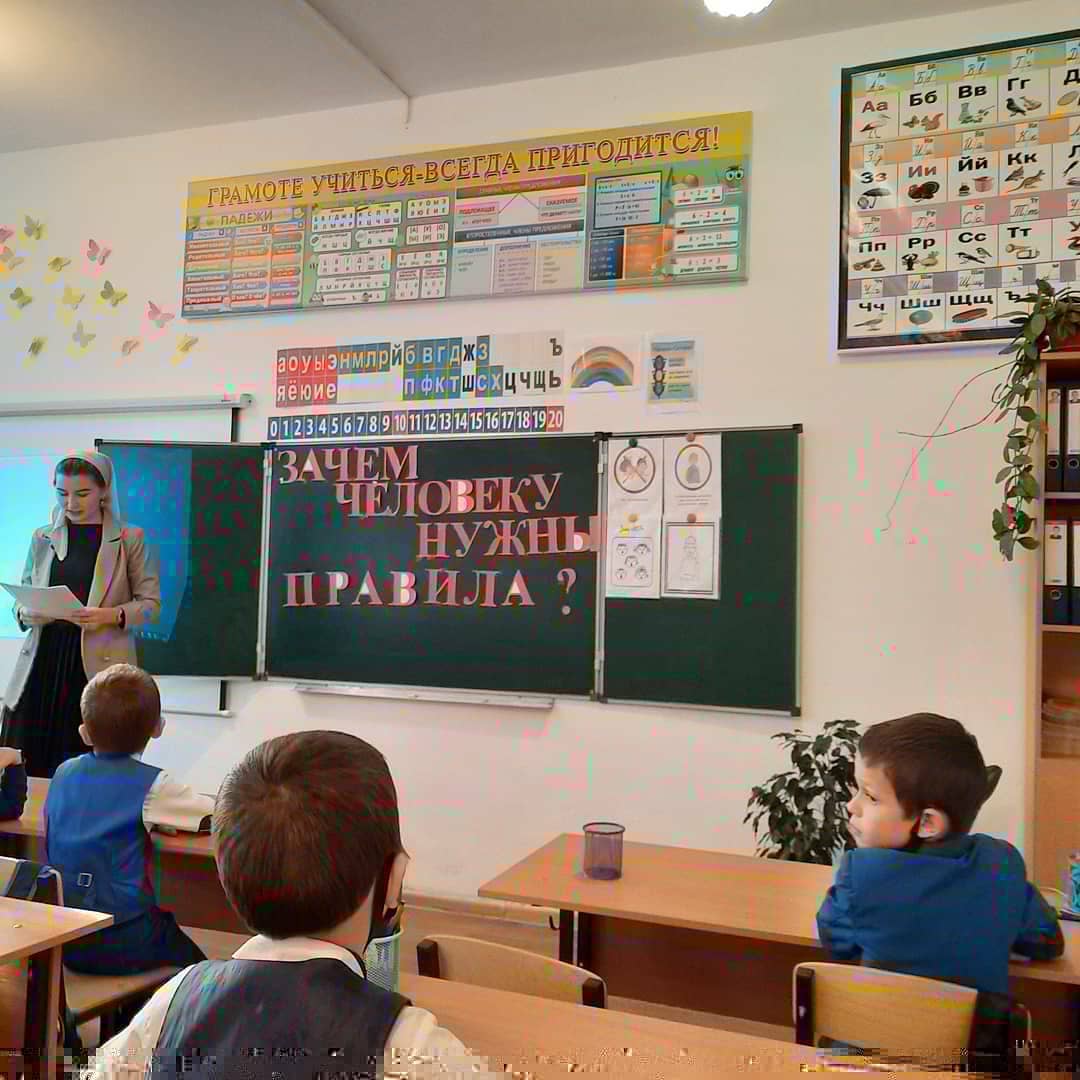 Чучаев Д.Р. выбрал очень нужную и актуальную тему для классного часа: "Нохчалла. Обычаи и традиции чеченцев". Думаю, что впервые дети узнали понятие "Нохчалла" в полном смысле этого слова от Дуквахи Ризвановича сегодня. Чеченское гостеприимство, белхи, мужской этикет, отношение к женщине, традиции - об этих понятиях дети узнали много нового и интересного.