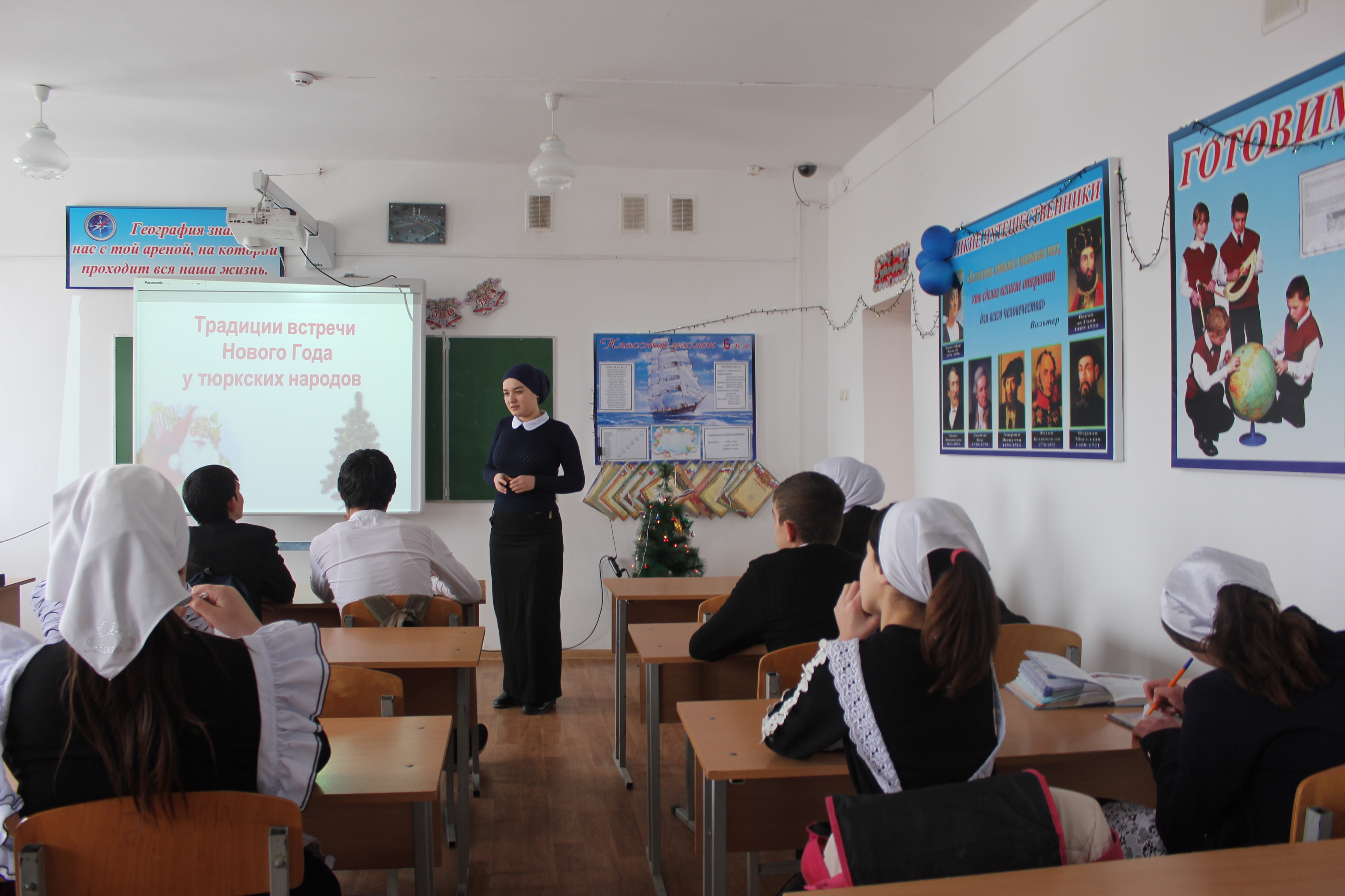 29.12.2016В целях формирования атмосферы межэтнической дружбы и согласия и усиления взаимовлияния культур народов Чеченской Республики зам. директора по ВР Гайсина Саида 29 декабря 2016 года провела урок на тему: «Новый год: история праздника» «Новогодние традиции этнических групп проживающих на территории ЧР».