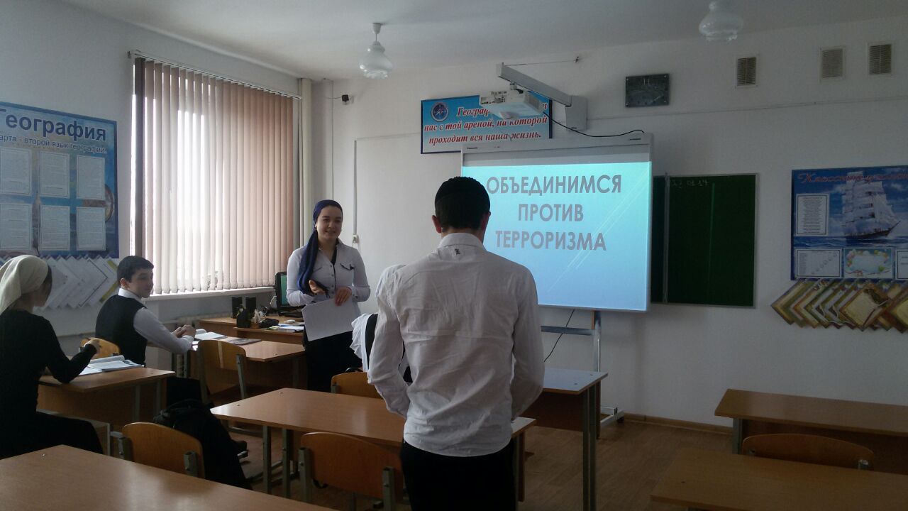 19.01.2017В целях антитеррористического образования и воспитания учащихся школы зам. директора по ВР Саида Гайсина 18–19 января 2017 года выступила перед родителями учащихся школы и провела профилактическую беседу – урок на тему «Объединимся против терроризма».