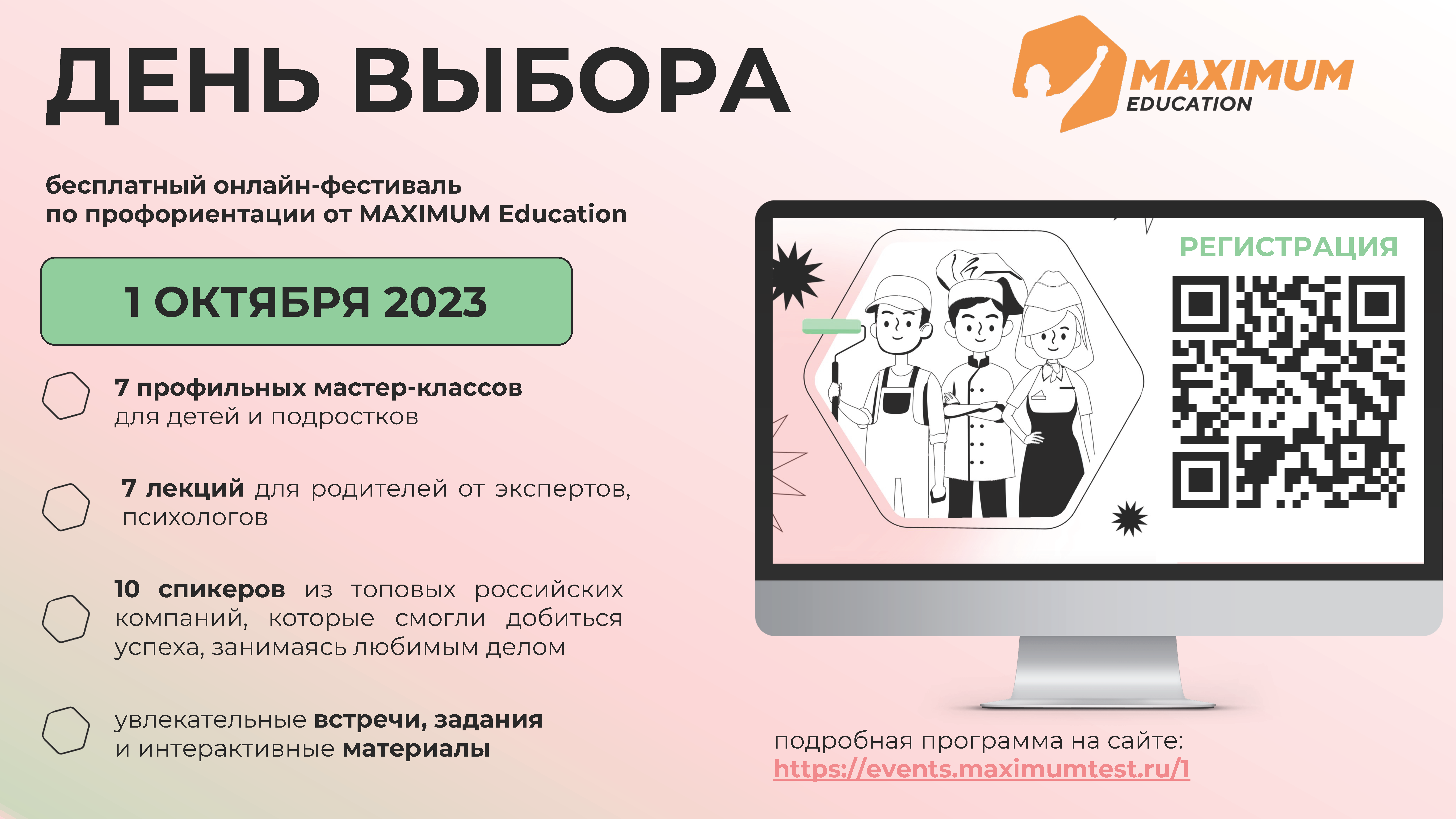 Организатором мероприятия является MAXIMUM Education – российская образовательная IT-компания, которая более 10 лет обучает школьным предметам, а также реализует бесплатные программы, направленные на улучшение успеваемости школьников, их профессиональную ориентацию, приобретение новых навыков и на эффективное участие родителей в образовательном процессе.Фестиваль «День выбора» проходит с 2022 года и традиционно собирает большое количество заинтересованных слушателей (в среднем 25 000 регистраций на каждое мероприятие) и много положительных отзывов.Осенний фестиваль «День выбора» — это прекрасная возможность для всех школьников 5-11 классов принять участие в мастер-классах на актуальные темы о выборе профессии, мотивации к учебе и жизни после школы, а также послушать вдохновляющие истории о профессиональном становлении людей, работающих в российских компаниях. Подростки смогут узнать как о достаточно известных и распространенных профессиях (например, учитель, инженер-робототехник, event-менеджер), так и о необычных и редких, таких как летчик, тренер по дельфинотерапии, мультипликатор и других. Это позволит ребятам познакомиться с многообразием мира профессий и станет первым шагом в профессиональном самоопределении. Специально для родителей подростков будут организованы мастер-классы по самым волнующим темам от экспертов MAXIMUM Education. Слушатели узнают о том, как помочь ребенку выбрать любимую профессию и что делать, если подросток совсем ничего не хочет. Родителям учеников 5-7 классов будет интересно послушать выступление Ирины Гришиной, психолога и руководителя профориентационных программ MAXIMUM, на тему успешных стратегий взросления. Также у всех слушателей будет возможность задать свои вопросы психологам и специалистам в области профориентации. Кроме этого, все зарегистрированные участники получат бесплатные интерактивные материалы по выбору профессии. Формат фестиваля позволяет принять участие всем заинтересованным - мероприятие проходит в выходной день (начало - в 10:00 по московскому времени), к трансляции можно подключиться откуда угодно, нужен только интернет.Для участия в бесплатном фестивале по профориентации «День выбора» нужно:Заранее пройти регистрацию участника на сайте: https://events.maximumtest.ru/1 1 октября 2023 года пройти по полученной ссылке и присоединиться к трансляцииВопросы об участии в мероприятии можно задать по электронной почте: tatyana.moiseeva@maximumtest.ru