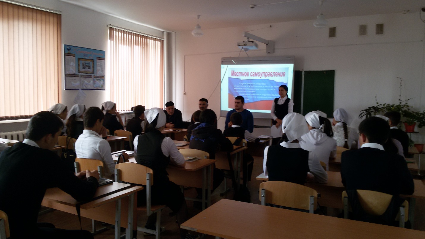 С 13 по 17 апреля в 8-11 классах прошли классные часы, посвященные этой дате.Цель классного часа: воспитание у школьников активной гражданской позиции, чувства ответственности за свою страну. Ребята познакомились с понятием института местного самоуправления, с основными функциями, а также со взаимоотношениями местного самоуправления и органов государственной власти. На кл.час в 8а классе были приглашены депутаты села Маазов Адланд, Багаев Осман и зам.главы Старогладовского с/п Хутуев А, которые интересно рассказали про органы местного самоуправления в нашем селе. У ребят было много вопросов о деятельности органов местного самоуправления, о благоустройстве села, о том, как связаться с депутатами, а также интересовались, как стать депутатом.