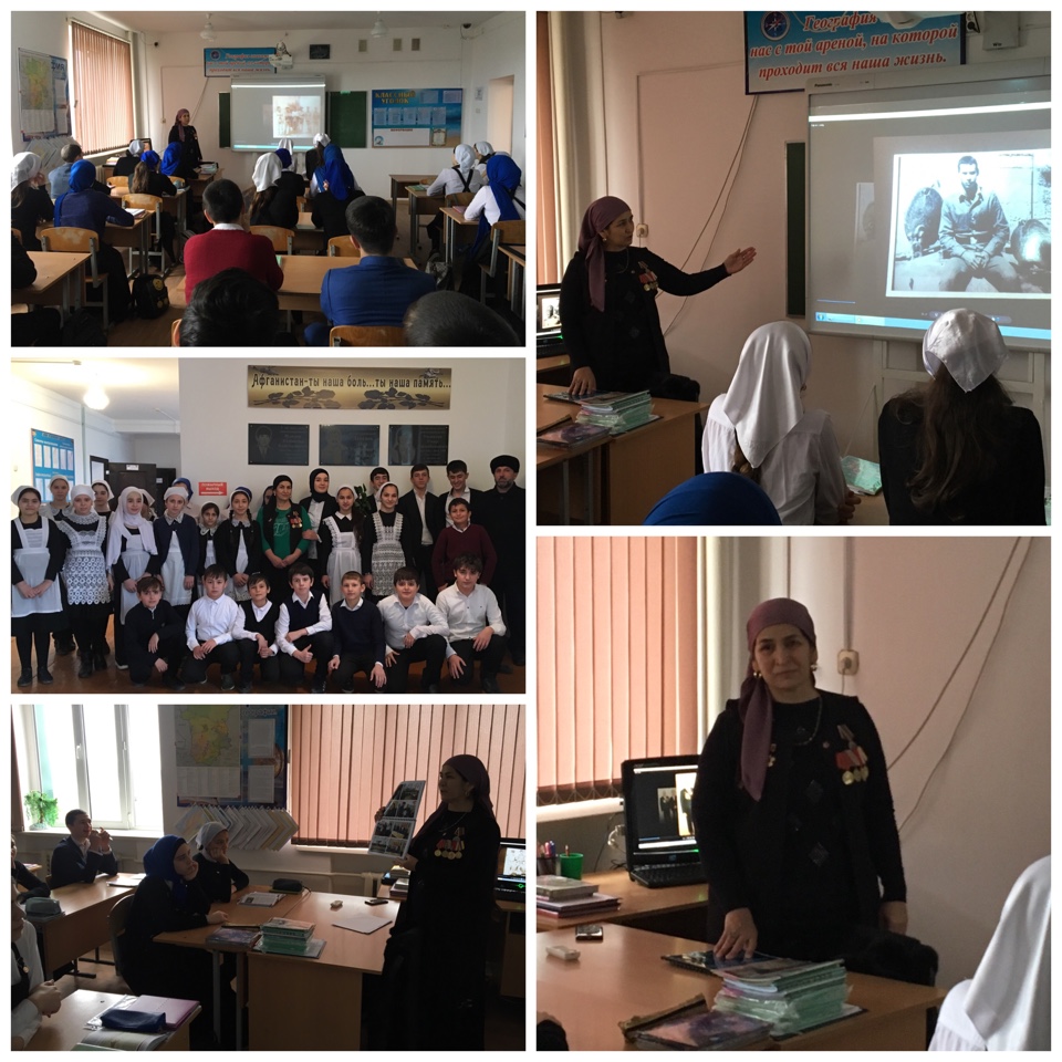 13.02.201913 февраля 2019 года в МБОУ «Старогладовская СОШ» проведено мероприятие-встреча на тему: «Из пламени Афганистана», посвященную 30 летию вывода советских войск из Демократической республики Афганистан. На мероприятие была приглашена Член правления и председатель вдов Чеченского Республиканского "Союза ветеранов Афганистана, локальных войн и военных конфликтов" советник председателясовета МОД "Коалиция"- Бугаева Жарадат Билаловна.