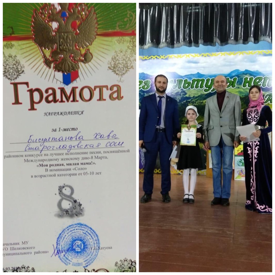 06.03.20196 марта 2019 года в Районном доме культуры прошёл конкурс на лучшее исполнение песни «Моя родная, милая мама!», посвящённый Международному женскому дню-8 марта. В конкурсе приняла участие и обучающая 2 «б» класса МБОУ «Старогладовская СОШ» Бисултанова Хава, которая получила 1 место в номинации «Соло» (возрастная категория от 5 до 10 лет).