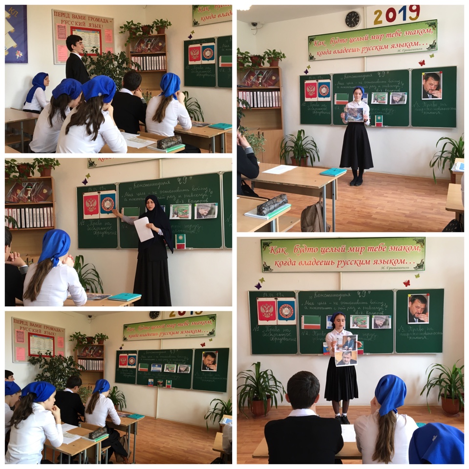 18.03.201918 марта 2019 года классным руководителем 10 класса Касаевой С.А. проведён открытый классный час «23 марта-День Конституции ЧР». Учитель рассказала обучающимся об истории Конституции Чеченской республики, о Первом Президенте ЧР, Герое России А. А. Кадырове, который болел и переживал за свой народ, знал все его тяготы, ни на минуту не покидал его в тяжелое время. Затем ребята вспомнили структуру и основное содержание главного Закона. Особое внимание уделили рассмотрению прав и обязанностей граждан. Были рассмотрены все вопросы, интересующие ребят. Цели, поставленные к классному часу, выполнены. Данное мероприятие прошло на хорошем профессиональном уровне. Сумая Абдуллаевна очень хорошо владеет навыками устно речи, умело, ненавязчиво вовлекает обучающихся в диалог, располагает к себе. И даже те, которых трудно «разговорить», на ее мероприятии активно принимали участие в диалоге.