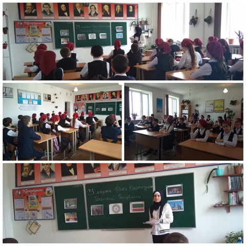 20.03.2019В целях решения задач гражданско-патриотического воспитания обучающихся 20 марта классным руководителем 5 «а» класса Майрахановой С. А. проведен открытый классный час ко Дню Конституции ЧР «Основной закон Чеченской Республики».Ребята работали с текстом Конституции и решали поставленные учителем задачи. На уроке вспомнили Первого Президента Чеченской Республики Кадырова А-Х.,о его роли в проведении референдума 23 марта 2003 года и принятии Конституции Чеченской Республики. Действия классного руководителя способствовали удачному проведению мероприятия: хорошо подобран демонстрационный материал, сценарий соответствовал возрастным особенностям пятиклассников . В ходе мероприятия Седа Абдрамановна проявляла тактичность, доброжелательность, умение увлечь всех общим делом.