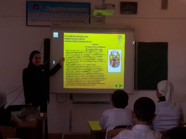 В школе имеется план мероприятий по противопожарной безопасности на 2015-2016 учебный год. Разработаны инструкции работников и учащихся по противопожарной безопасности. На этажах вывешены планы эвакуации. В связи с началом отопительного сезона, а также в преддверии осенних каникул во всех классах были проведены беседы по профилактике пожарной безопасности в период отопительного сезона. Все беседы отмечены в классных журналах и в журналах инструктажей. Вопросы пожарной безопасности обсуждались на уроках ОБЖ, учитель Загибов М.Х. 10 класс тема урока «Способы эвакуации», учитель Гайсина С.Р. 8б кл «Правила поведения при пожаре».